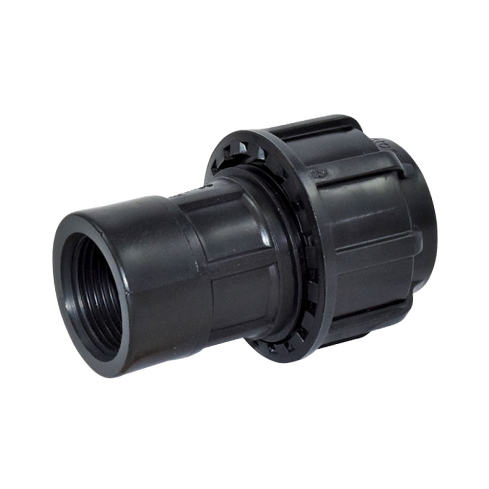 PP Kupplung mit einseitigem Innengewinde zum Verbinden von PE Rohren mit einem Rohr-Außendurchmesser 25 mm auf Gewindegröße 3/4".