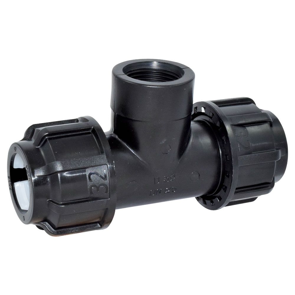PP T-Stück mit einseitigem Innengewinde zum Verbinden von 2 PE Rohren mit einem Rohr-Außendurchmesser von 25 mm auf G3/4".