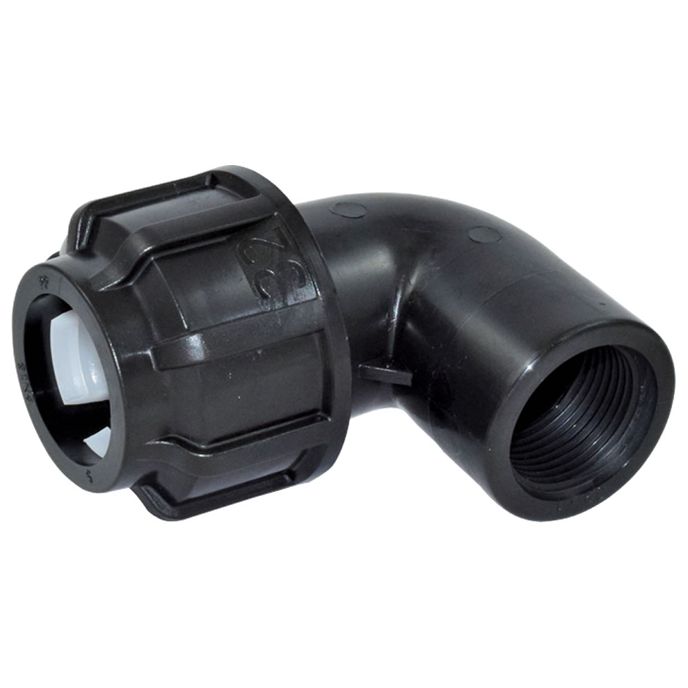 PP Winkel mit einseitigem Innngewinde zum Verbinden von PE Rohren mit einem Rohr-Außendurchmesser von 25 mm auf Gewindegröße 3/4".