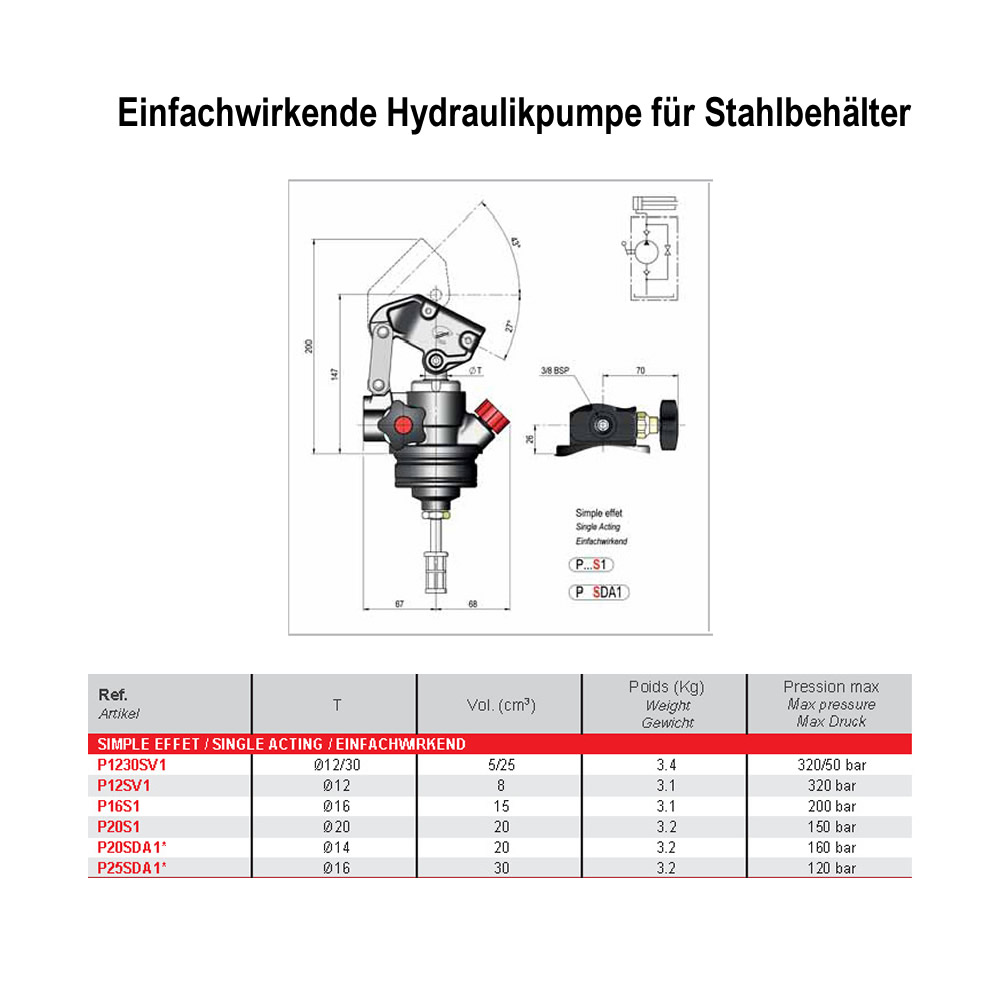Hydraulikhandpumpe, einfachwirkend, für Stahlbehälter