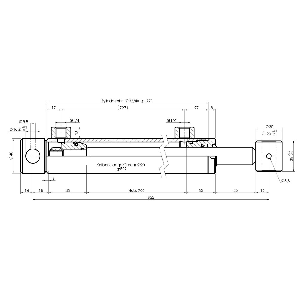 Hydraulikzylinder doppeltwirkend - Hub 700mm, Druckkraft ca. 1,6 Tonnen, 200bar