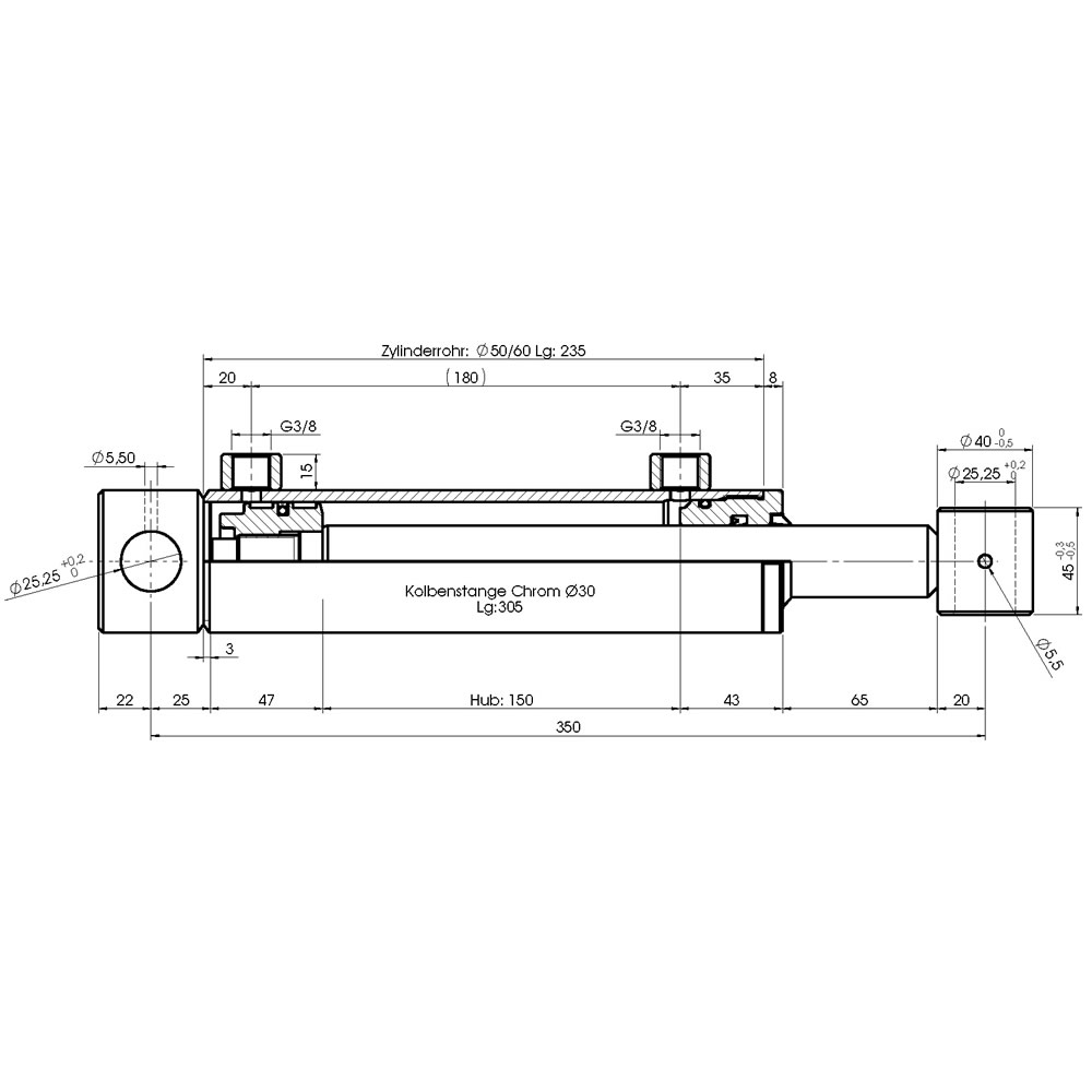 Dieser doppeltwirkende Hydraulikzylinder ist ein Qualitätsprodukt der Marke Chapel. Ein doppeltwirkender Hydraulikzylinder (Hydraulikstempel) hat zwei Kolbenflächen, die von beiden Seiten mit Hydraulikflüssigkeit beaufschlagt werden können. Damit kann der Zylinder aktiv ein- und ausfahren. Die Wirkfläche beim Einfahren ist geringer als beim Ausfahren, weil die Kolbenstange des Zylinders an dieser Fläche befestigt ist. Damit hat der Zylinder beim Einfahren eine höhere Geschwindigkeit und eine geringere Kraft (Zugkraft) als beim Ausfahren.