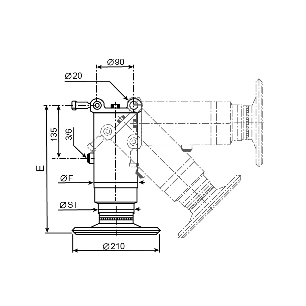 technische Zeichnung Stützzylinder, einfachwirkend, mit Rückholfeder