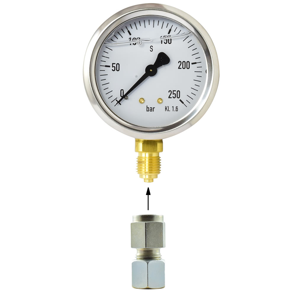 Lieferung inkl. Dichtkantenring DKI, Überwurfmutter und Schneidring, ohne Manometer.