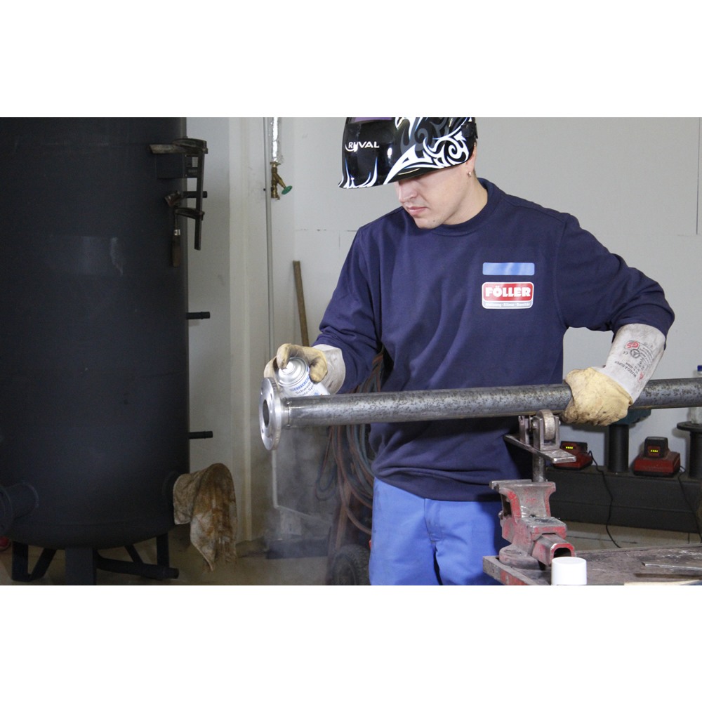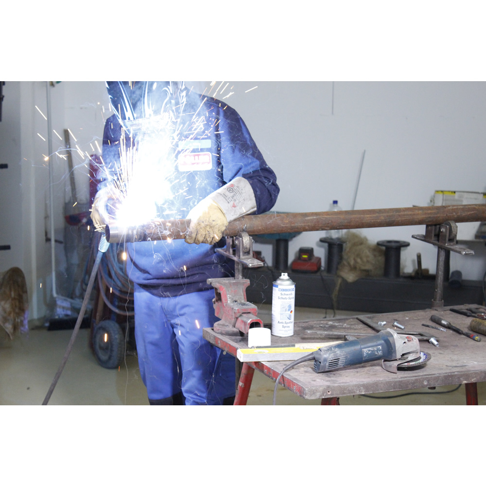 Schweiß-Schutz-Spray verhindert das Anhaften von Schweißspritzern an Gasdüsen und Werkstückoberflächen, bietet lückenlosen Schutz beim Schweißvorgang und macht eine Nachreinigung der Werkstücke mit Spatel, Bürste oder Meißel überflüssig.